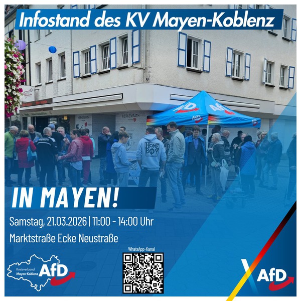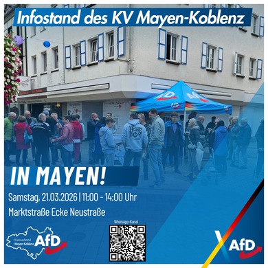 Die AfD Mayen-Koblenz wird bis zum Wahltag am 26.09.21 an jedem Wochenende auf Infoständen im Landkreis unsere Positionen erläutern und freut sich auf den weiteren Gedankenaustausch mit den Bürgern!“, so der Kreisvorsitzende Thomas Damson.
